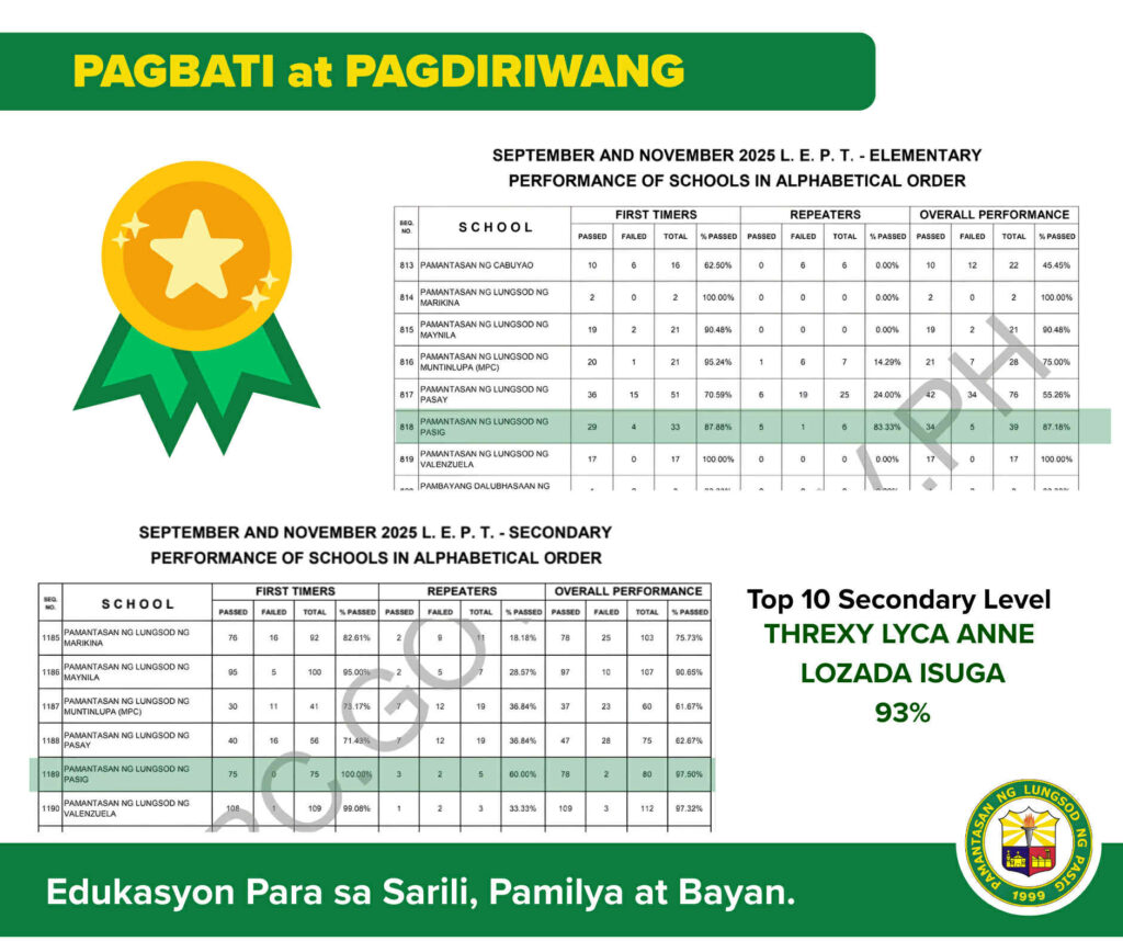 The Pamantasan ng Lungsod ng Pasig (PLP), through its College of Education, recorded an outstanding performance in the recent Professional Licensure Examination for Teachers (PLET), further affirming the institution’s commitment to academic excellence.