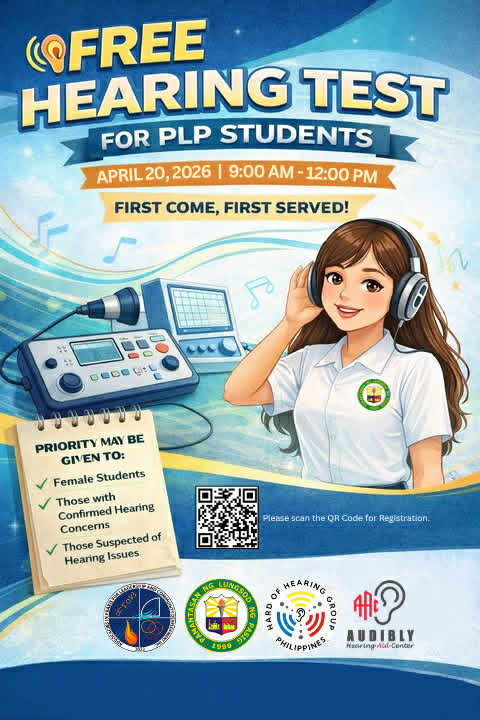 Pamantasan ng Lungsod ng Pasig through Advocacies in Praxis for Leadership and Community Development in partnership with Hard of Hearing Group Philippines and Audibly Hearing Aid Center invites PLP students and employees to a FREE Hearing Test!