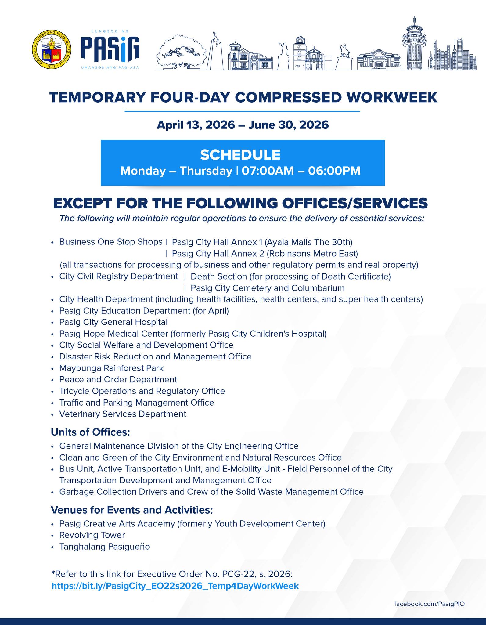The Pamantasan ng Lungsod ng Pasig (PLP) respectfully informs all students, parents, partners, and the general public that the University shall implement a Four-Day Compressed Work Week, pursuant to the Executive Order No. PCG-22 series of 2026 issued by the Honorable City Mayor of Pasig.