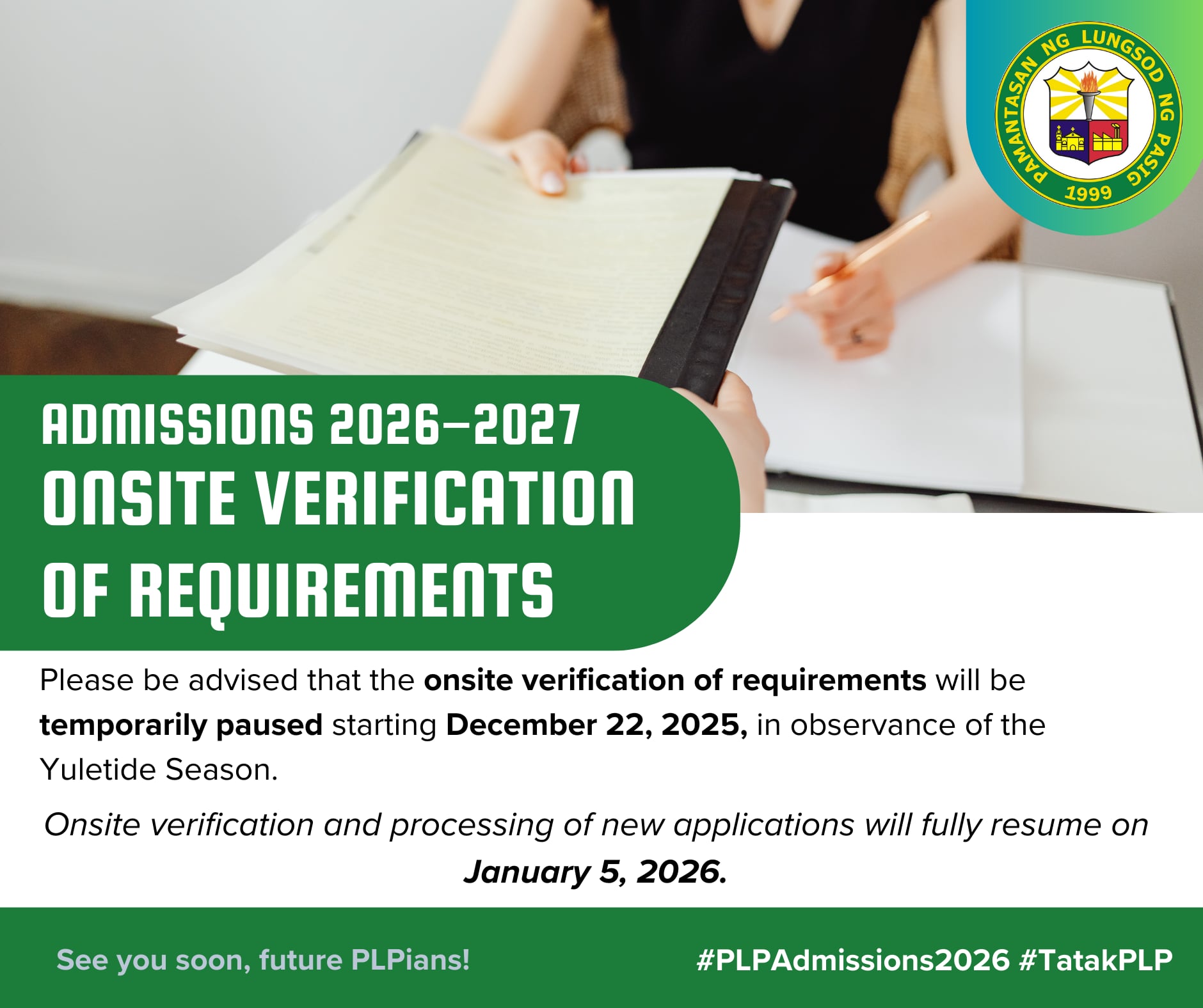 Please be advised that the onsite verification of requirements for Admissions 2026-2027 will be paused effective December 22, 2025, in the observance of the Yuletide Season.