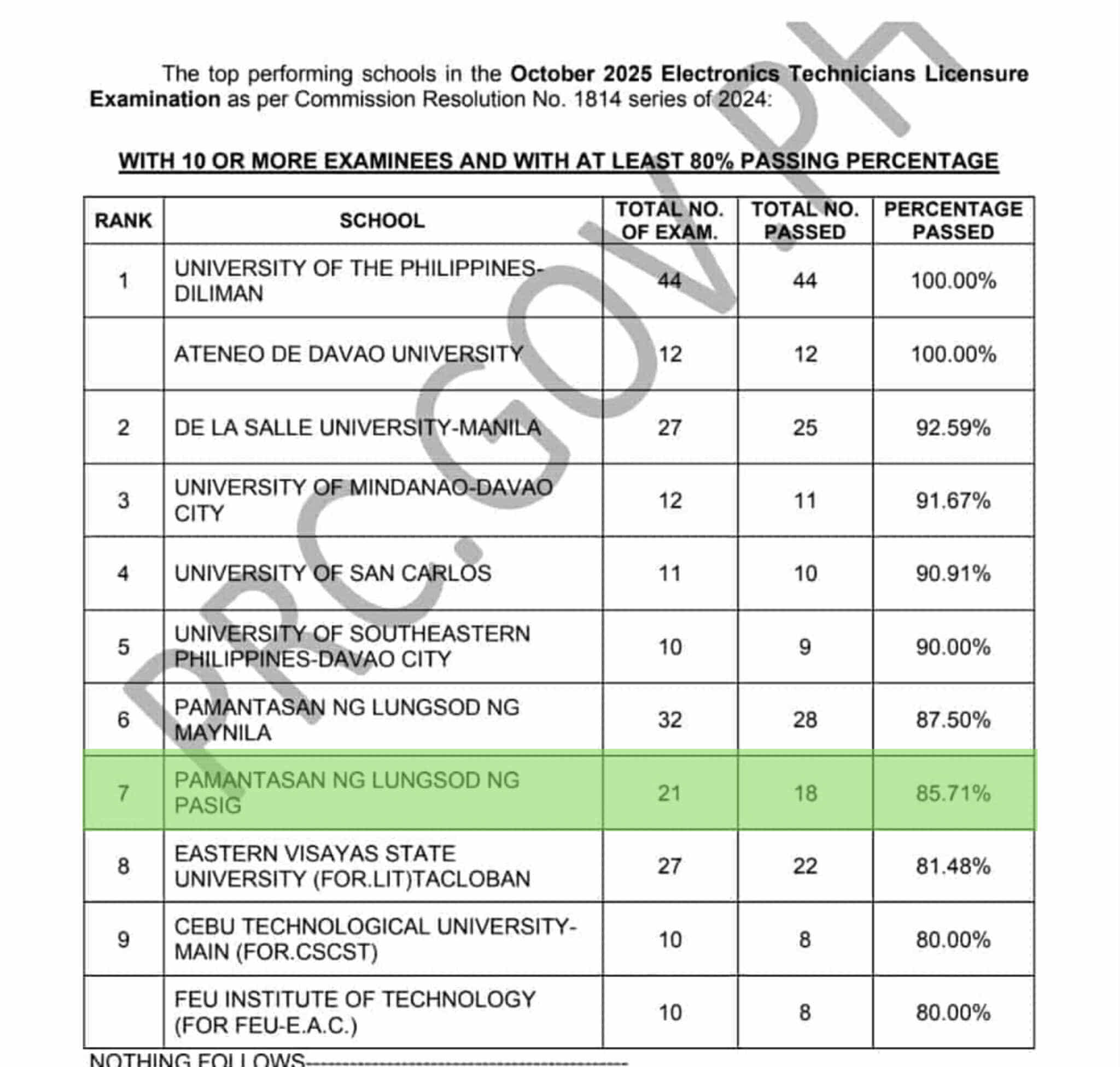 Pamantasan ng Lungsod ng Pasig Among Top Performing Schools in October 2025 Electronics Technicians Licensure Exam