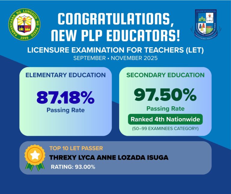 The Pamantasan ng Lungsod ng Pasig (PLP), through its College of Education, recorded an outstanding performance in the recent Professional Licensure Examination …
