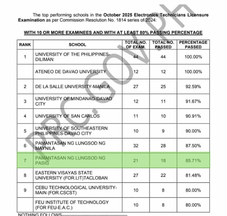 The Pamantasan ng Lungsod ng Pasig (PLP) proudly secured its place among the top-performing schools in the October 2025 Electronics Technicians Licensure …